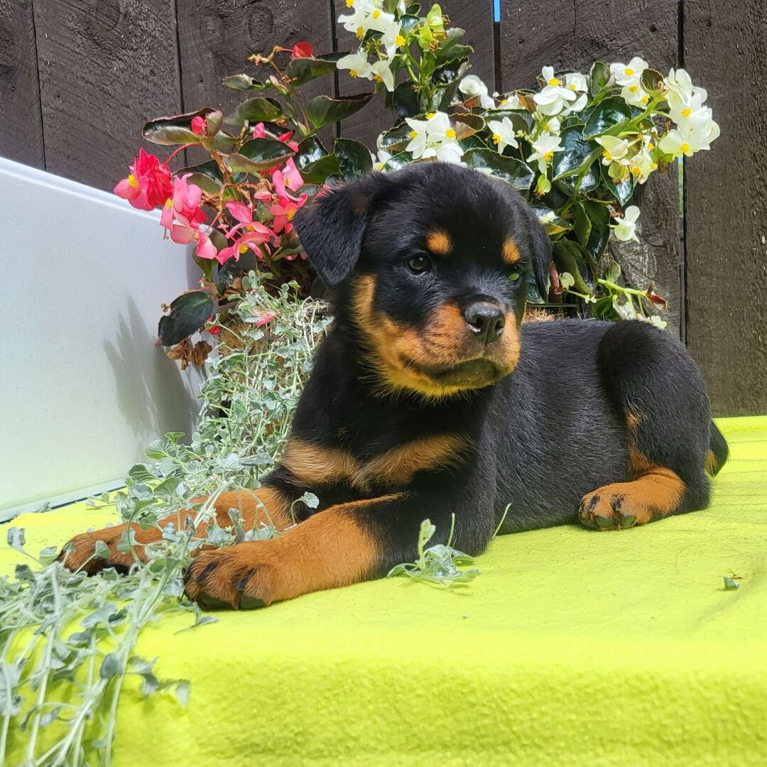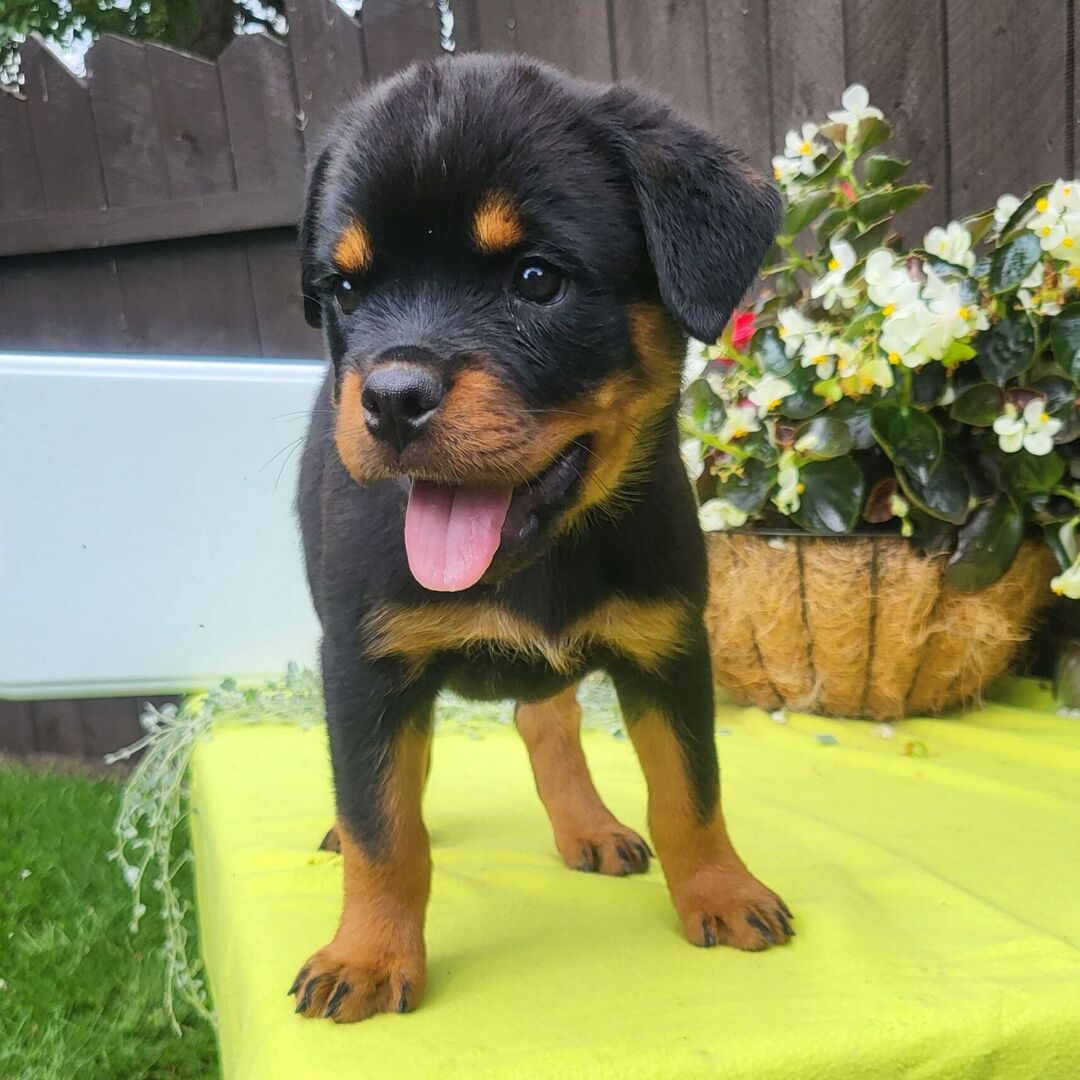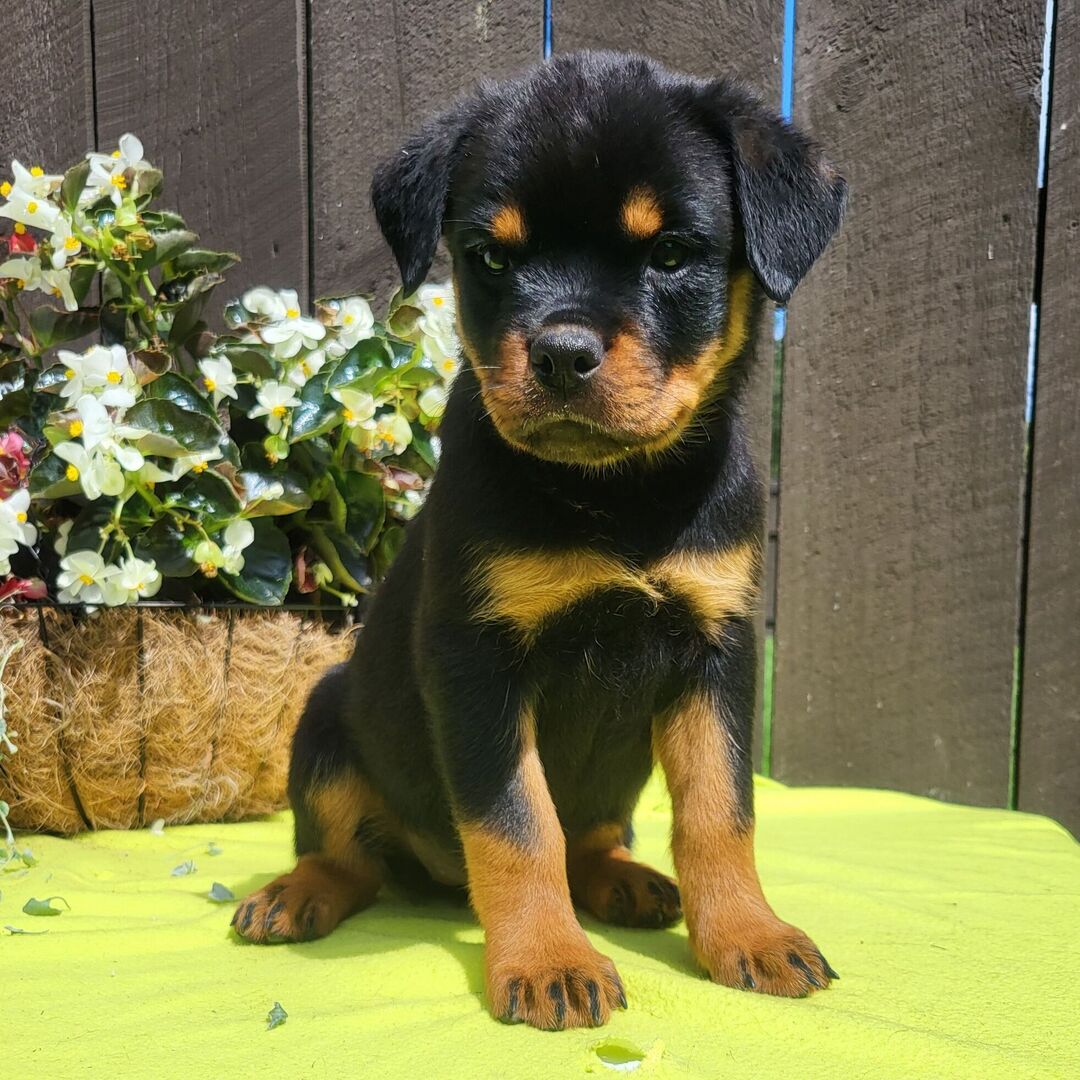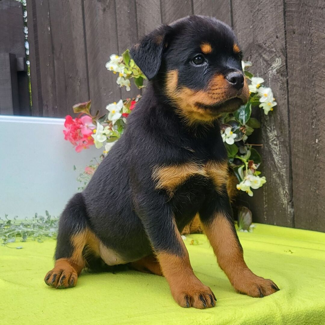 Hi, I’m Gabon! I’m an 8-week-old female Rottweiler with a beautiful black & mahogany coat, born on June 28, which makes me a Cancer pup. I am ready now to plan my trip to my forever family. Once I reach my adult size, I’m expected to weigh between 70–110 lbs. I’m AKC registered. I’m ready to shower you with love and lots of wet-nosed kisses.