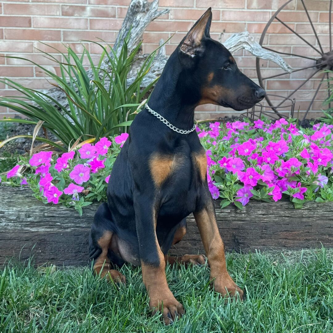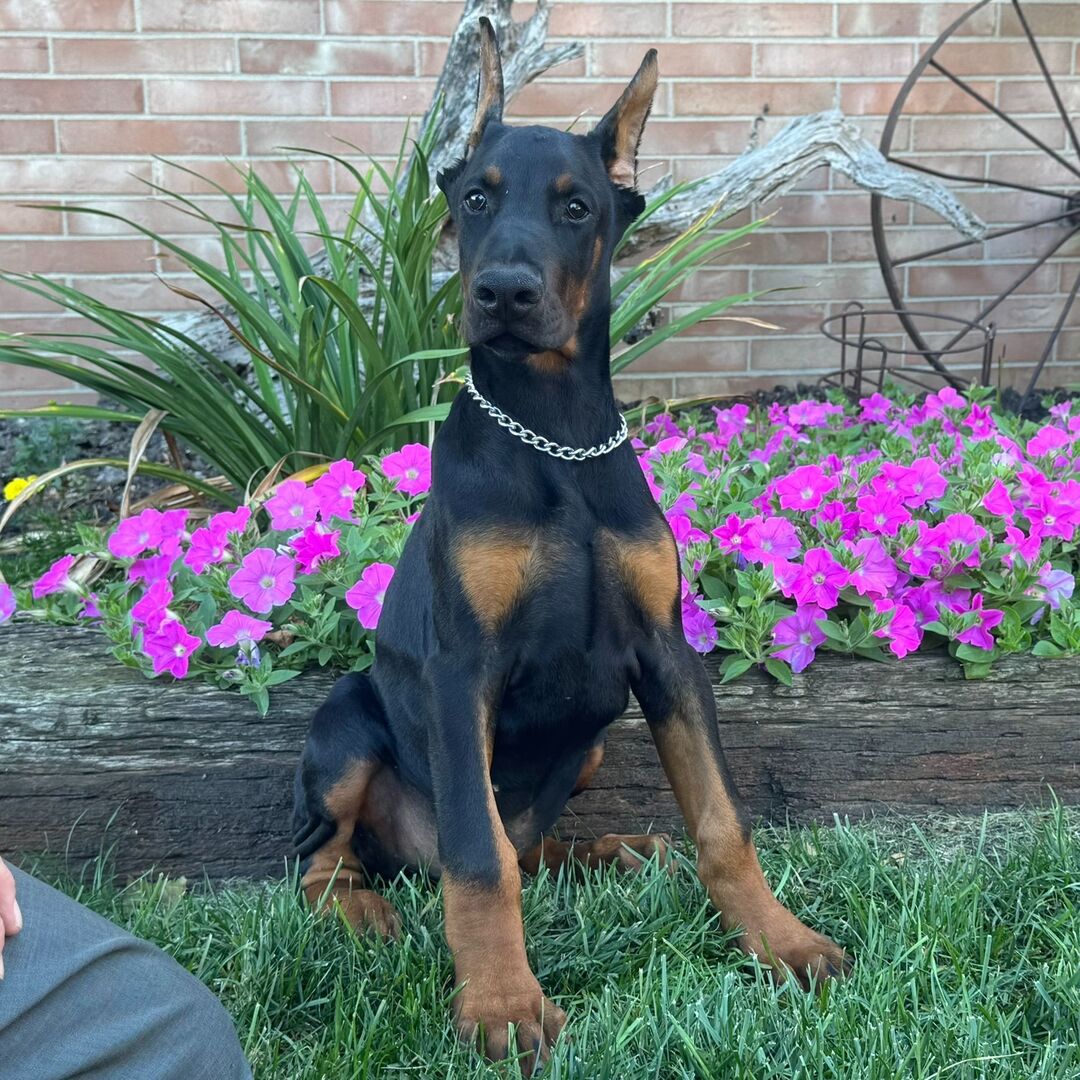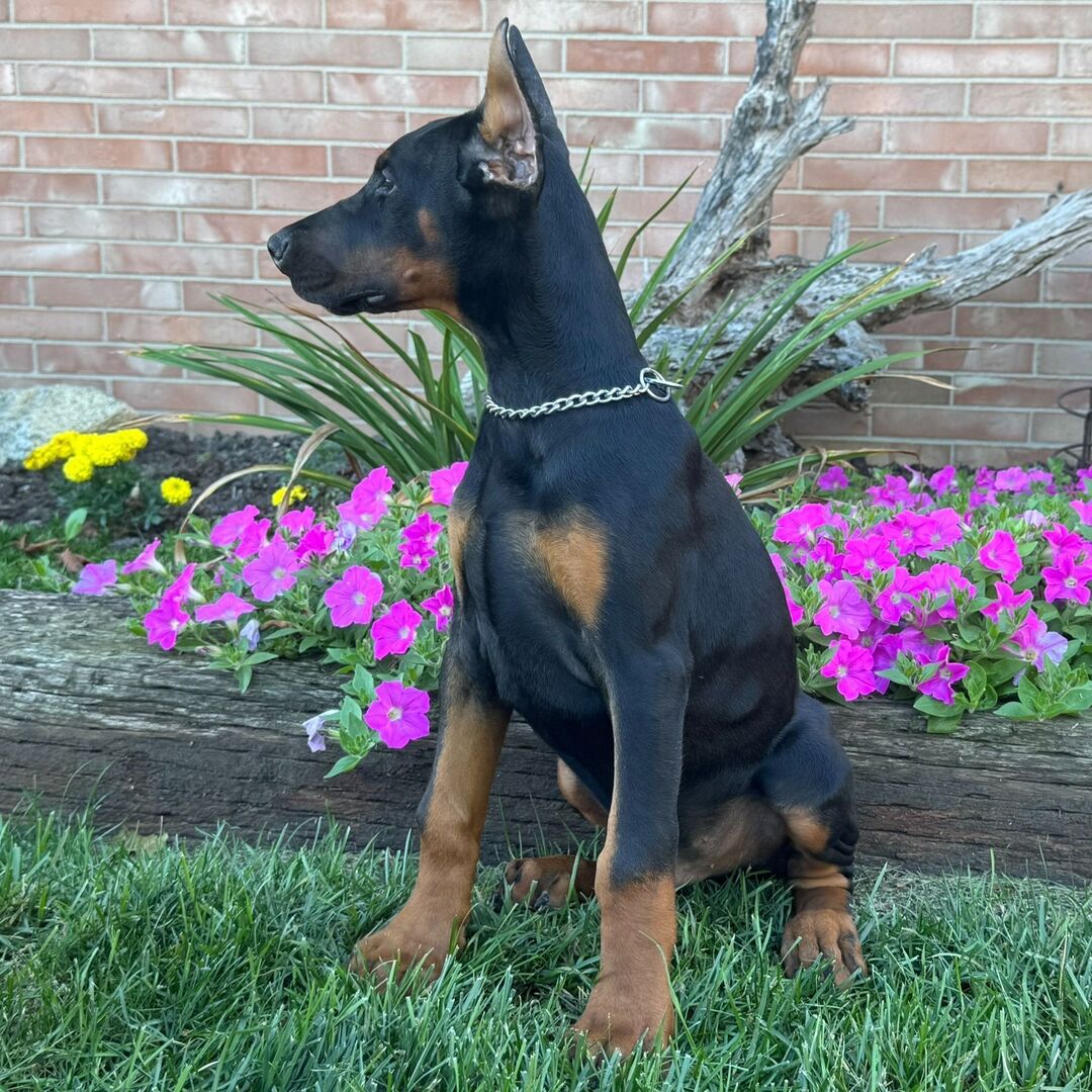 Hi, I’m Onyx! I’m a 15-week-old male Doberman Pinscher with a beautiful black & rust coat, born on May 27, which makes me a Gemini pup. I am ready now to plan my trip to my forever family. Once I reach my adult size, I’m expected to weigh between 65–110 lbs. I’m AKC registered. I’m excited to be your loyal companion and cuddle buddy.