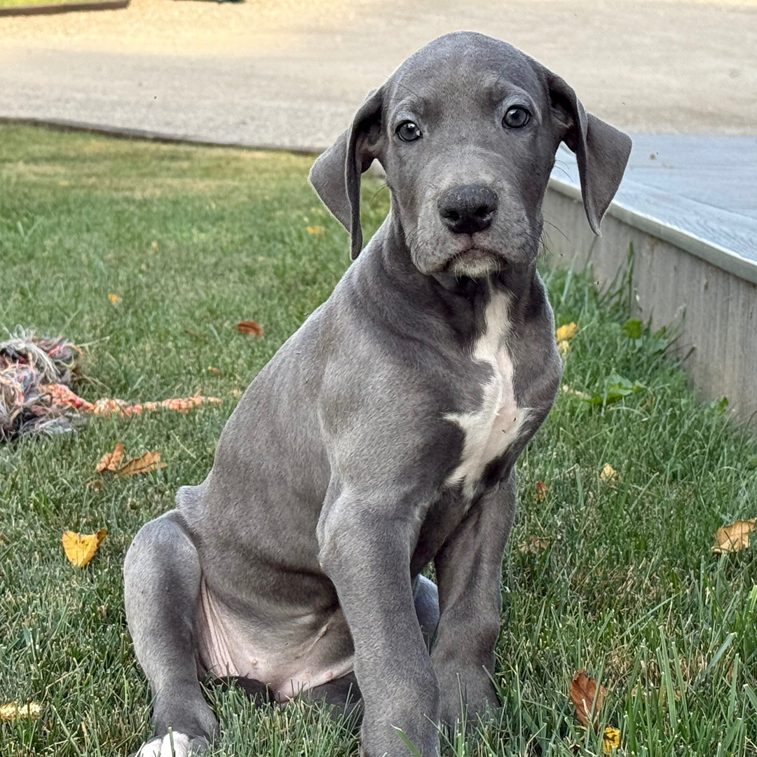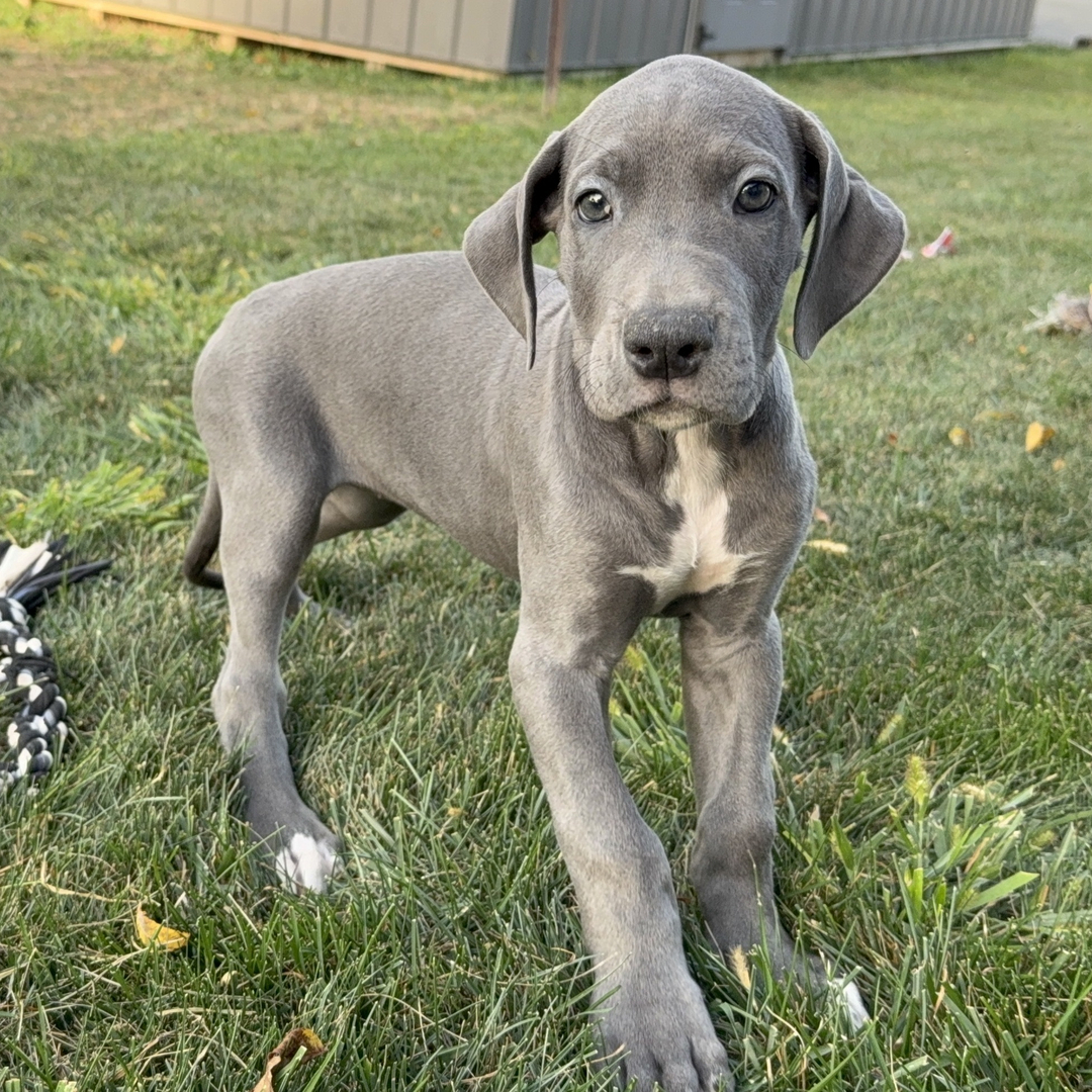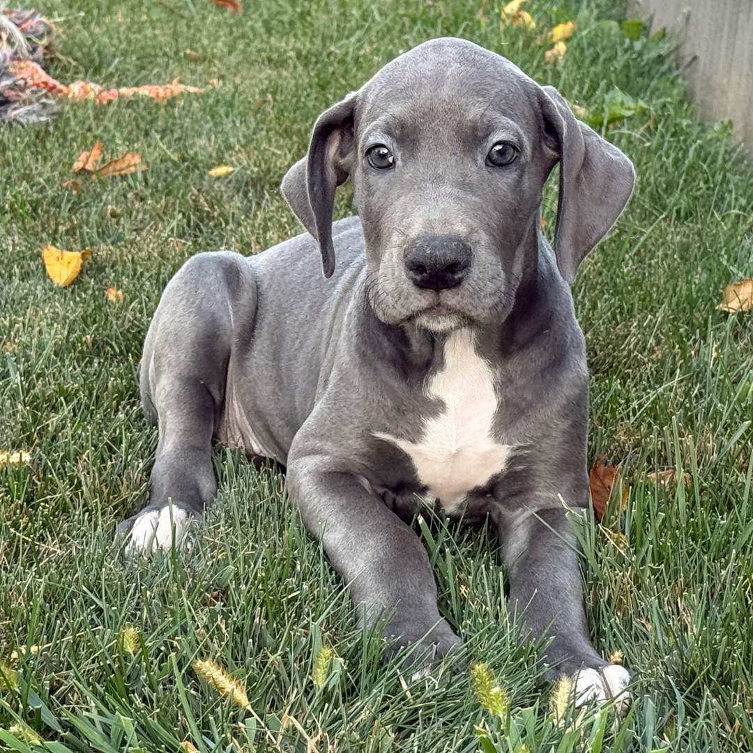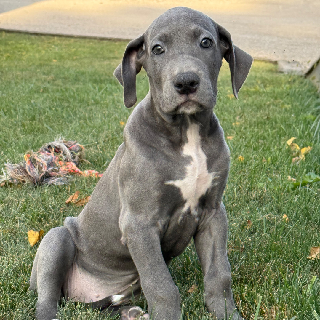 Hi, I’m Wendy! I’m a 9-week-old female Great Dane with a beautiful blue coat, born on July 8, which makes me a Cancer pup. I am ready now to plan my trip to my forever family. Once I reach my adult size, I’m expected to weigh between 100–150 lbs. I’m AKC registered. My little paws are itching to meet my forever family.
