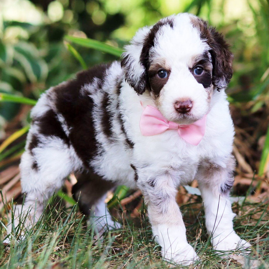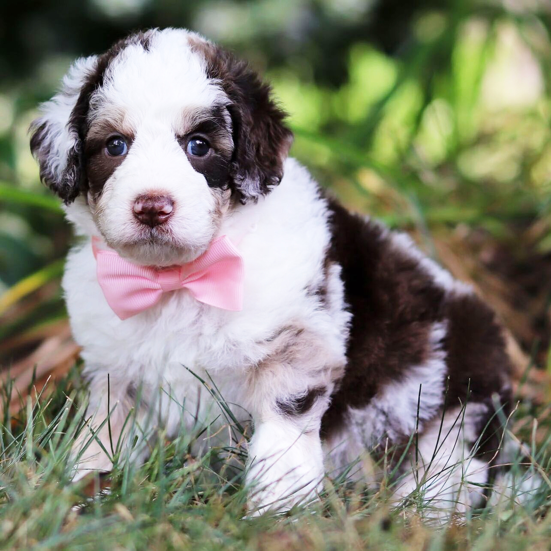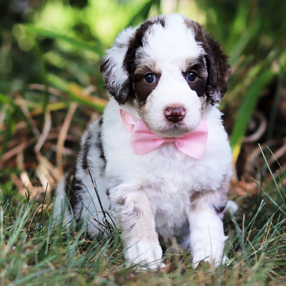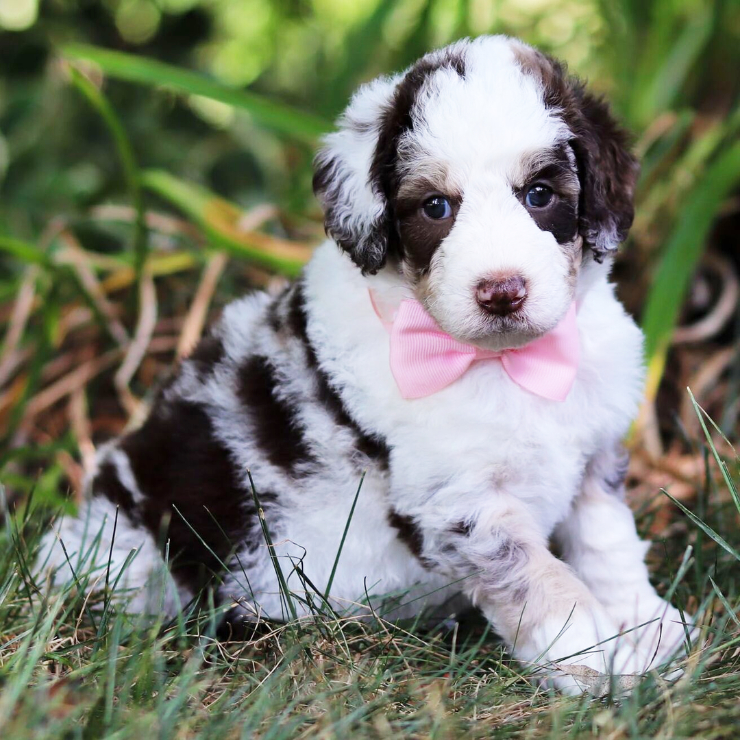 Hi, I’m Willa! I’m a 5-week-old female Bernedoodle with a beautiful chocolate merle & white coat, born on July 23, which makes me a Leo sign. I’ll be ready to go home to my forever family after September 17, once I’m grown enough to leave my litter. I’m looking forward to filling your life with love and wagging tails.